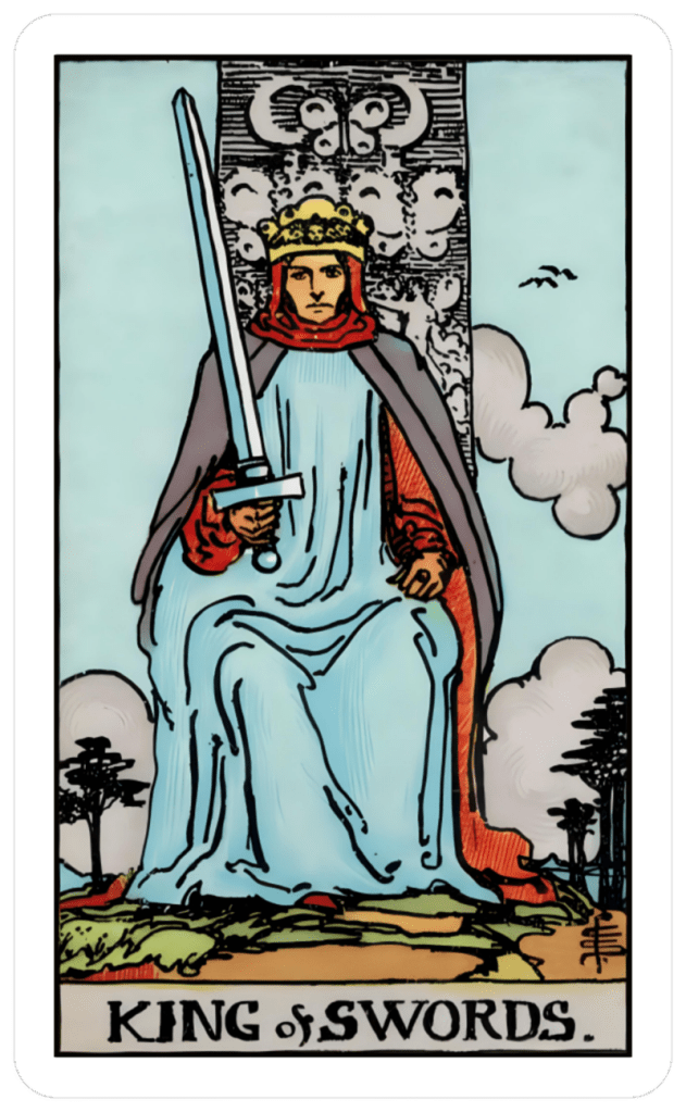 The King of Swords is a powerful and authoritative figure representing intellectual clarity, wisdom, and decisive communication. It signifies a person who is logical, rational, and skilled at problem-solving. The King of Swords is a natural leader, known for their sharp mind and ability to make fair and just decisions.
