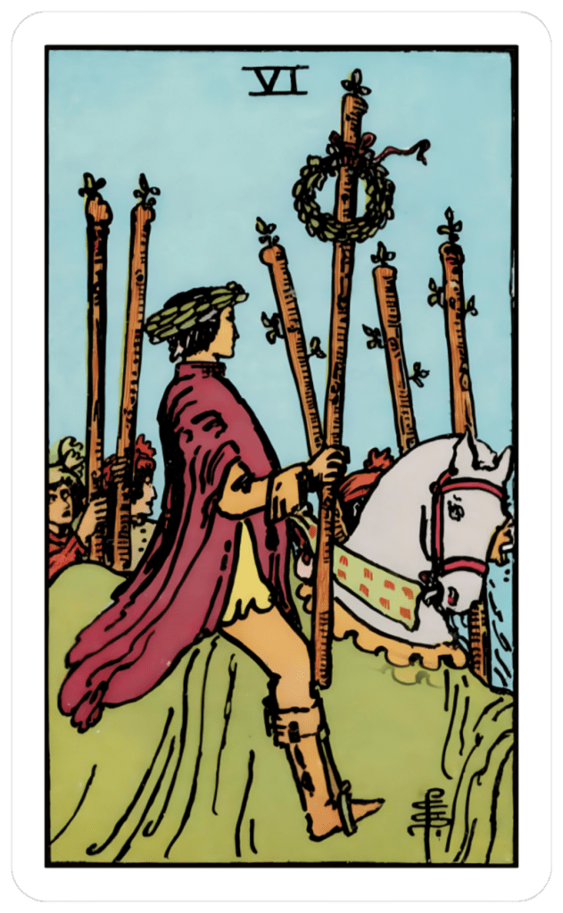 In the Rider-Waite tarot deck, the Six of Wands depicts a man riding on a horse, surrounded by a jubilant crowd. The man holds a wand adorned with a laurel wreath, symbolizing triumph and honor. The crowd’s cheers and applause reflect the acknowledgment and admiration that come with achieving your ambitions.