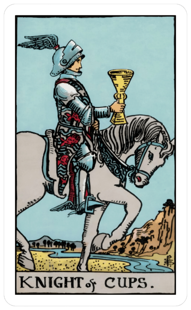 In the Rider-Waite Tarot deck, the Knight of Cups is depicted as a knight riding on a white horse, holding a cup in one hand, representing his emotional nature, and wearing armor decorated with images of fish, symbolizing the depths of his emotional realm.