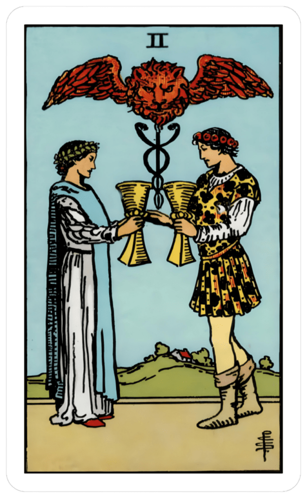 The Two of Cups Tarot card represents harmony, connection, and love. When this card appears in a Tarot reading, it often suggests the presence of a special bond between two individuals.