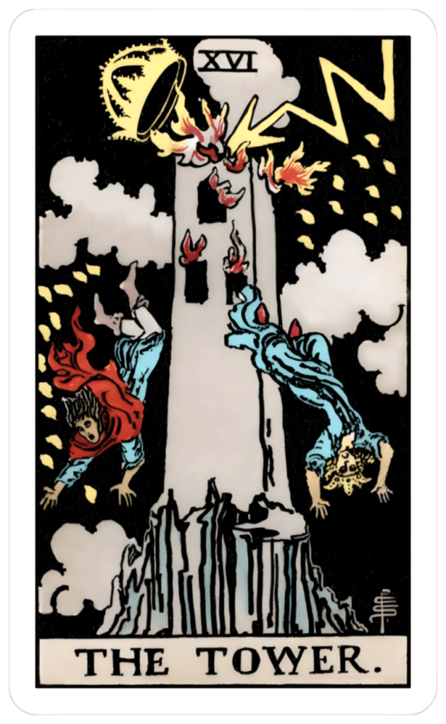 The card illustrates a tall tower being struck by lightning, with people falling from its heights. This symbolizes the collapse of old ways and belief systems, paving the way for new beginnings and personal transformation.
