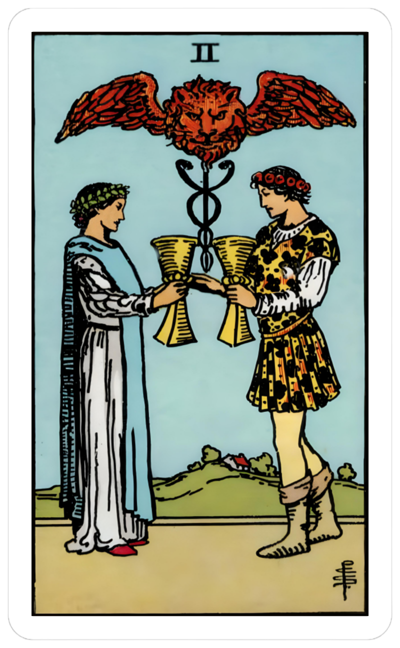Unity and duality. Relationships, partnerships. Working together in harmony. Two of Cups>