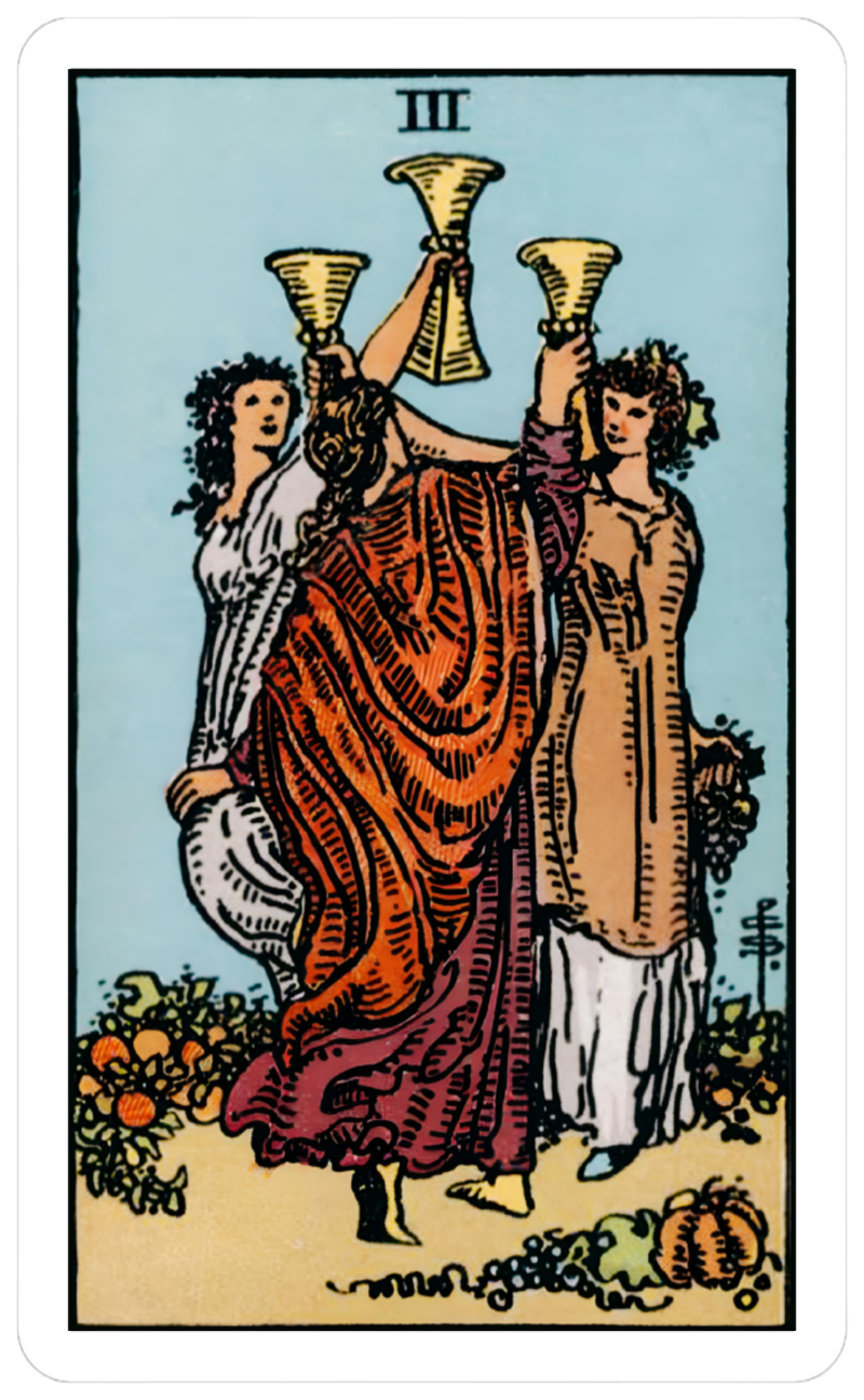 Celebrating with friends. Accomplishments, success, achievement. Three of Cups>