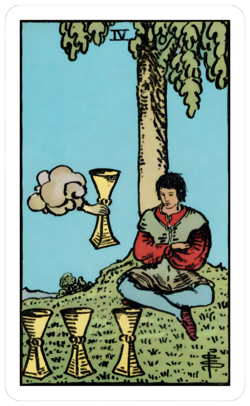 Solitude, Introspection. Taking time to reflect. Not open to new possibilities. Four of Cups>